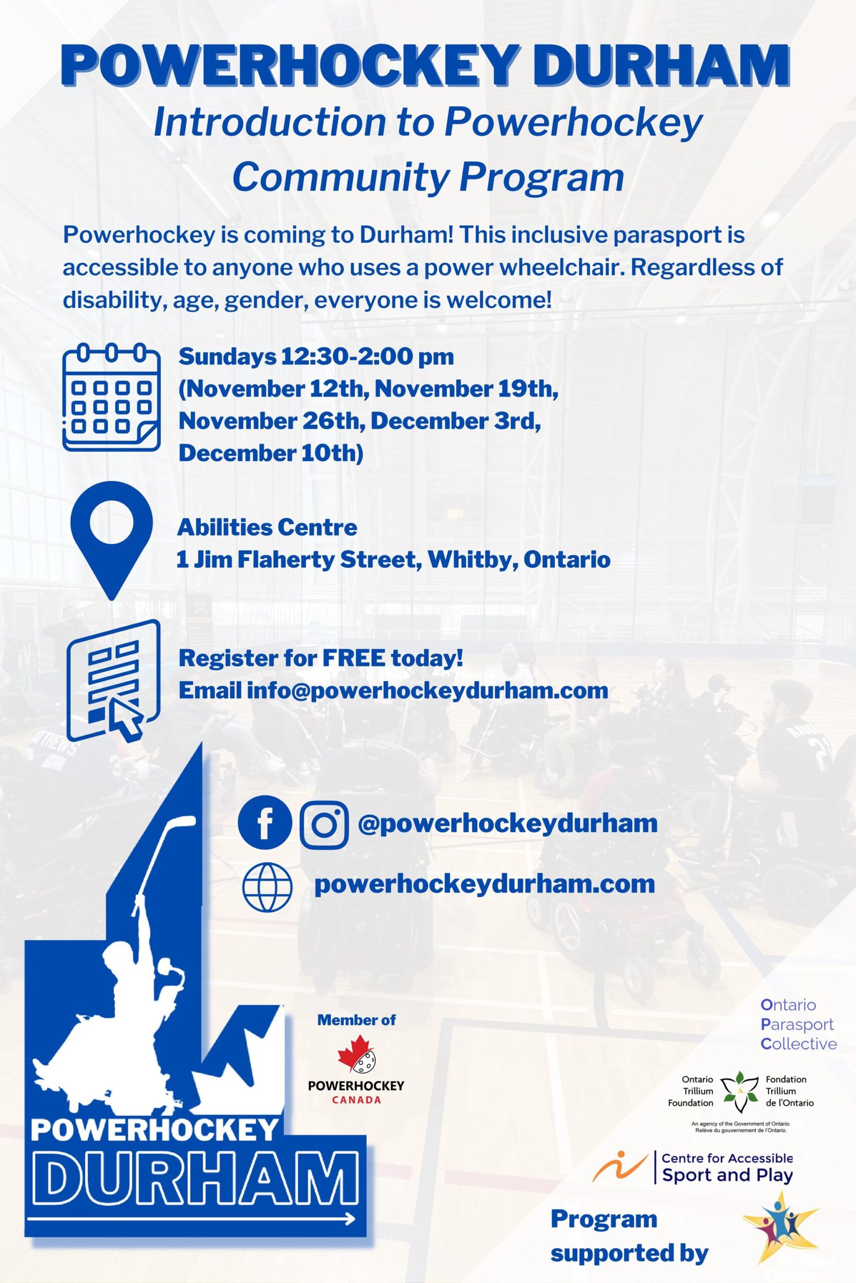 We are so appreciative of our supporters who have helped make PowerHockey Durham a reality! Thank you to the Ontario Parasport Collective and the Ontario Trillium Foundation who have provided funding to ensure registration f is FREE! Also thank you to the Abilities Centre for partnering with us on the program and the Centre for Accessible Sport and Play whose guidance and support has been instrumental in the development of PowerHockey Durham.
